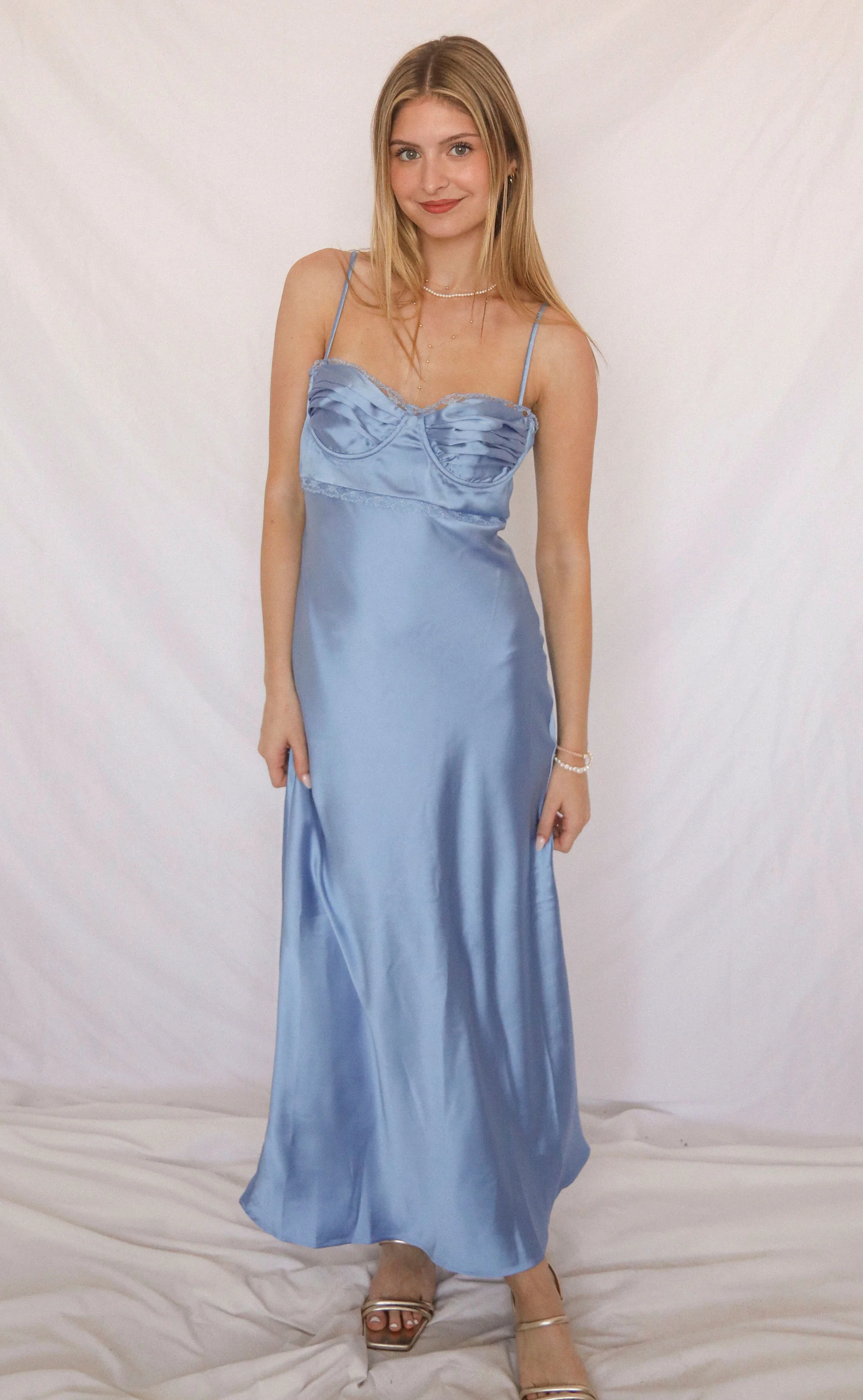 The Florianne Dress from ASTR is absolutely stunning! The blue satin shines as you move and the lace detail adds a bit of a sexy touch. From top to bottom, this dress has adjustable straps, a bustier silhouette, bust underwire and a perfectly draping skirt.Â