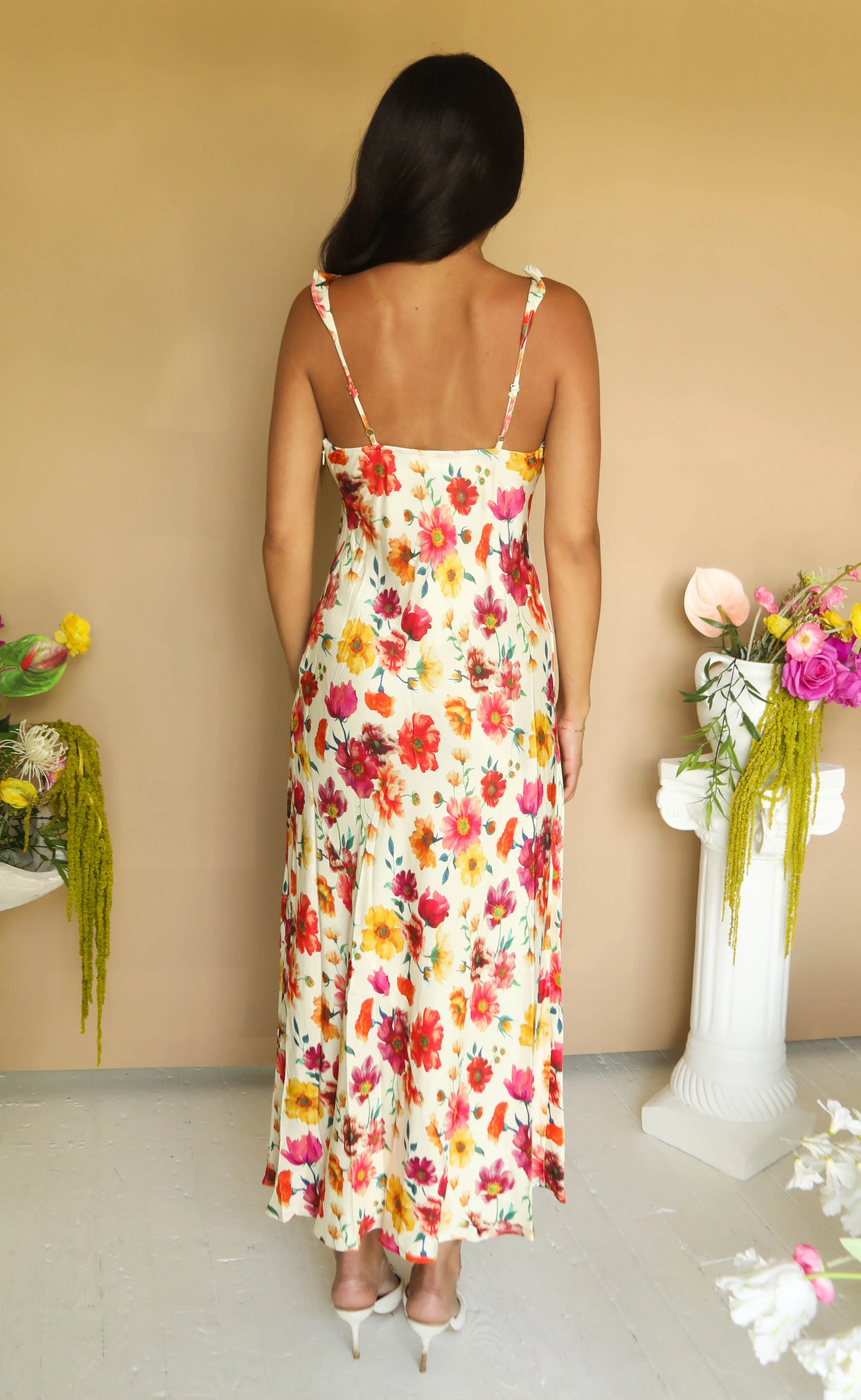 The Zoie Dress from ASTR is a stunning, curve skimming satin ruffle midi with a v-neckline, adjustable straps and seam detail under the bust in an all over cream and multi colored floral. It's unlined and has a concealed size zipper.
