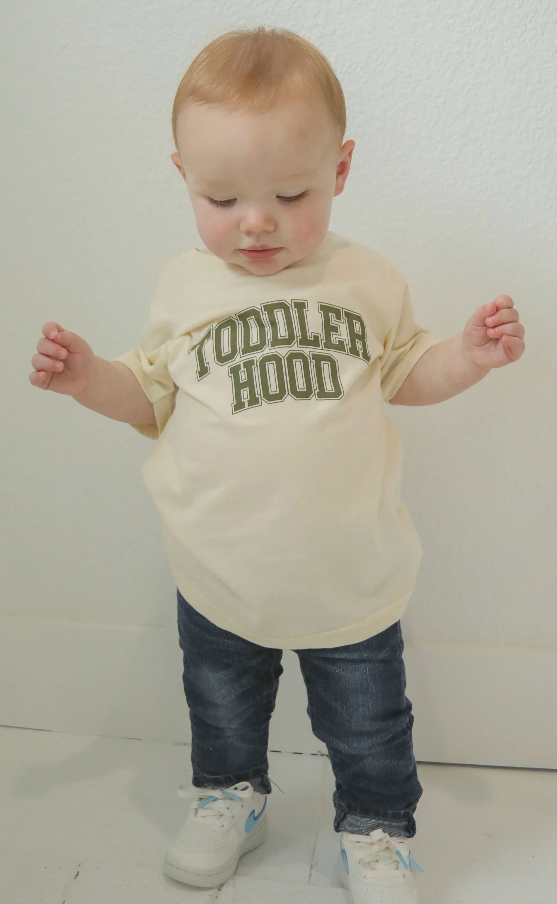 The most hardcore "hood" there is - toddlerhood! ;) This creamed colored toddler tee is an easy "throw on" outfit when your toddler is....well....being a toddler!Â