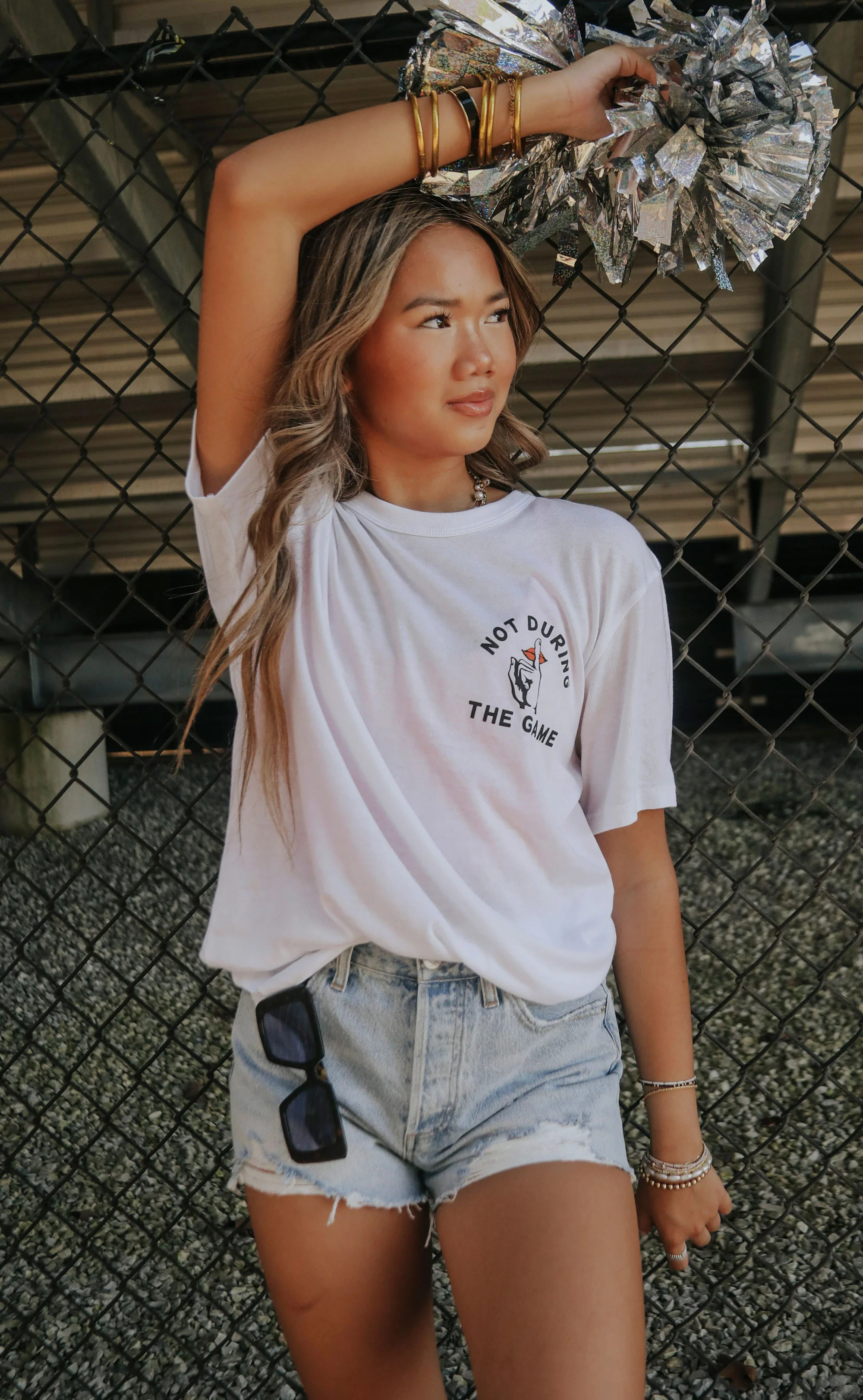 Let your tee do all the talking. This white blank adds something to everyone's closet with the adorable back graphic! Dress this one up with your favorite skirt and heels and you'll be ready to cheer on the quarterback!Â