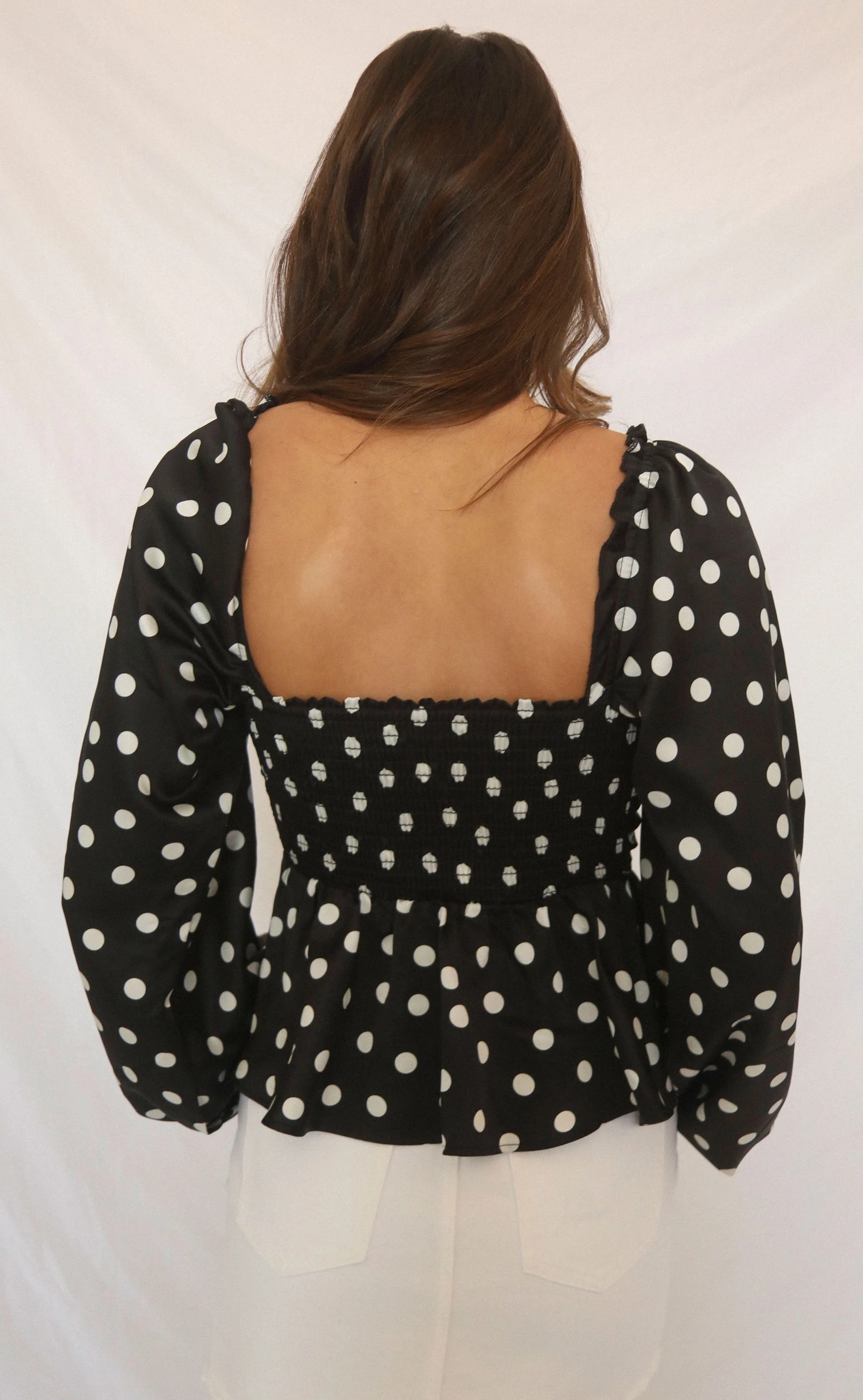 The Atiana Top from Show Me Your Mumu is a flattering blouse that can take you from best dressed in the office straight into date night. With a square neckline, long bishop sleeves and a peplum style silhouette, this black and white polka dot blouse is to die for.