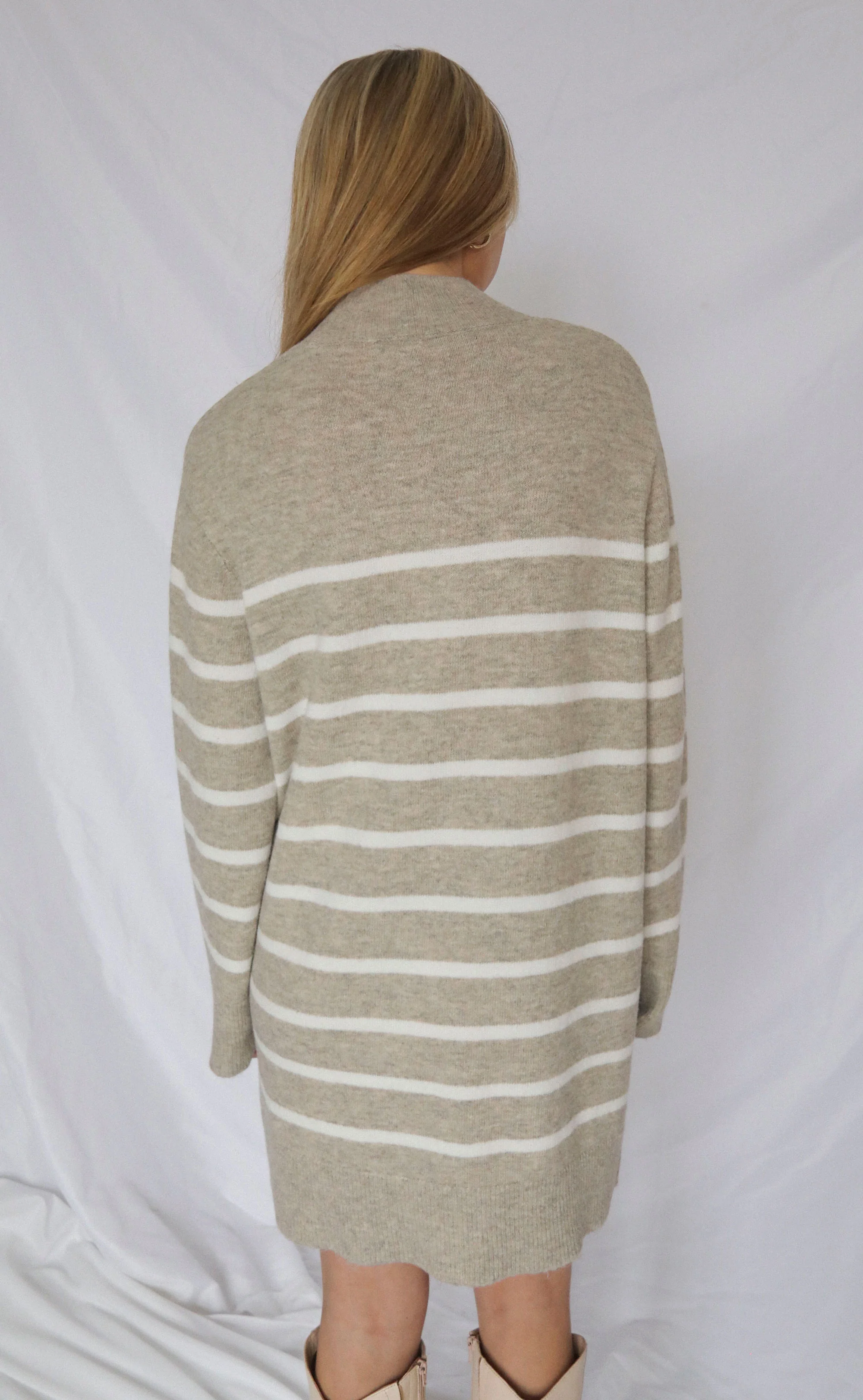 Classic stripes meet cozy comfort in this midweight turtleneck sweater mini dress, made from soft yarns with a timeless stripe pattern. With its flattering fit and long sleeves, it’s the perfect go-to for those cool, crisp days.
